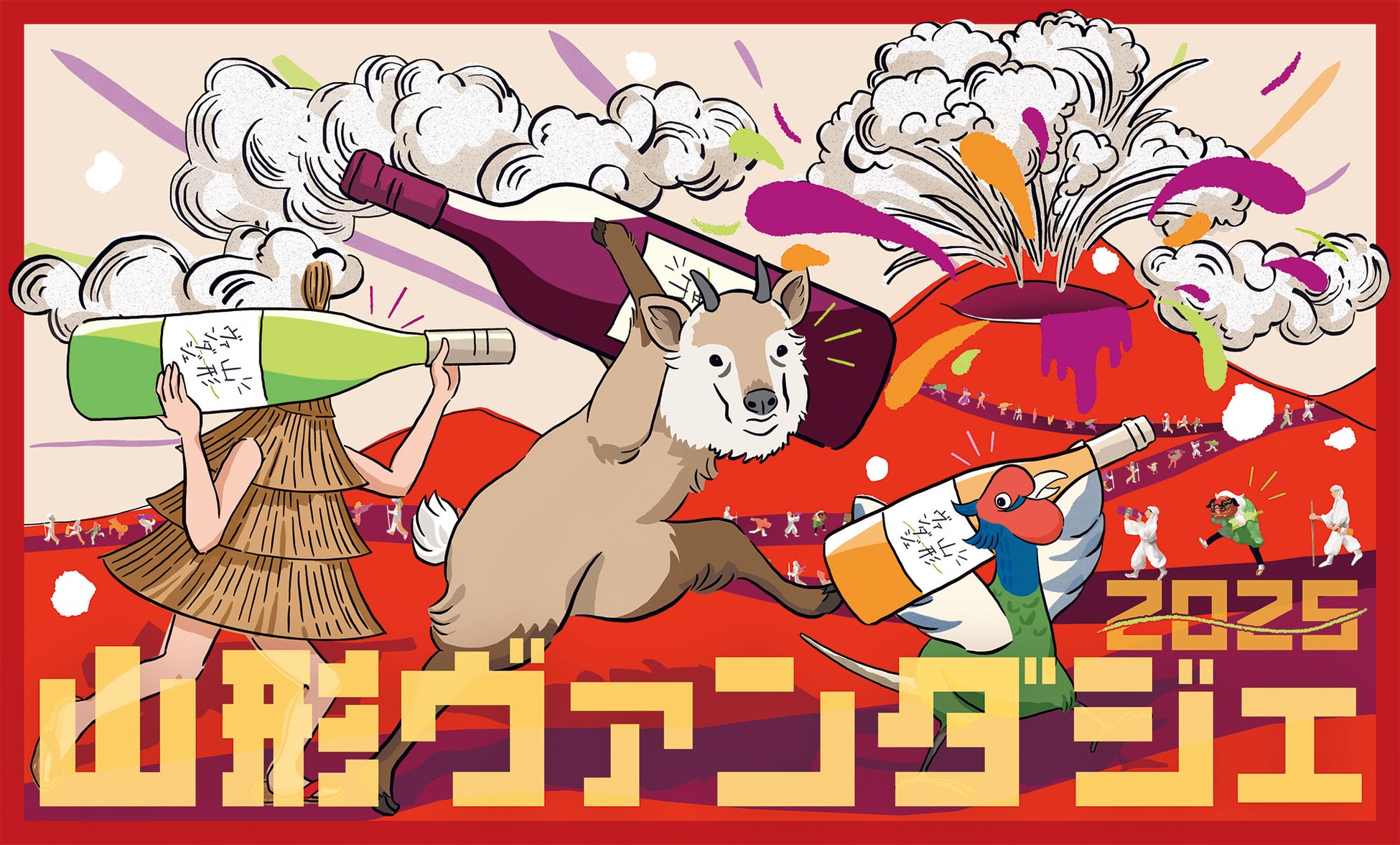 今回開催される「山形ヴァンダジェ 2025」のテーマは「はじける山形」です。山形県には「穏やか」「物静か」という印象がありますが、個性の際立つ山形県産のワインを世界中の人に知ってもらう事を通じ、これまでとは違う新たな山形県産のワインの一面を知っていただきたい、という思いから東京での開催を決定いたしました。キービジュアルについても、今年のテーマ「はじける山形」を象徴するように、カモシカや加勢鳥といった、山形県の個性ある動物や妖怪が、蔵王山の噴火と共にワインを楽しむ様子が描かれています。
